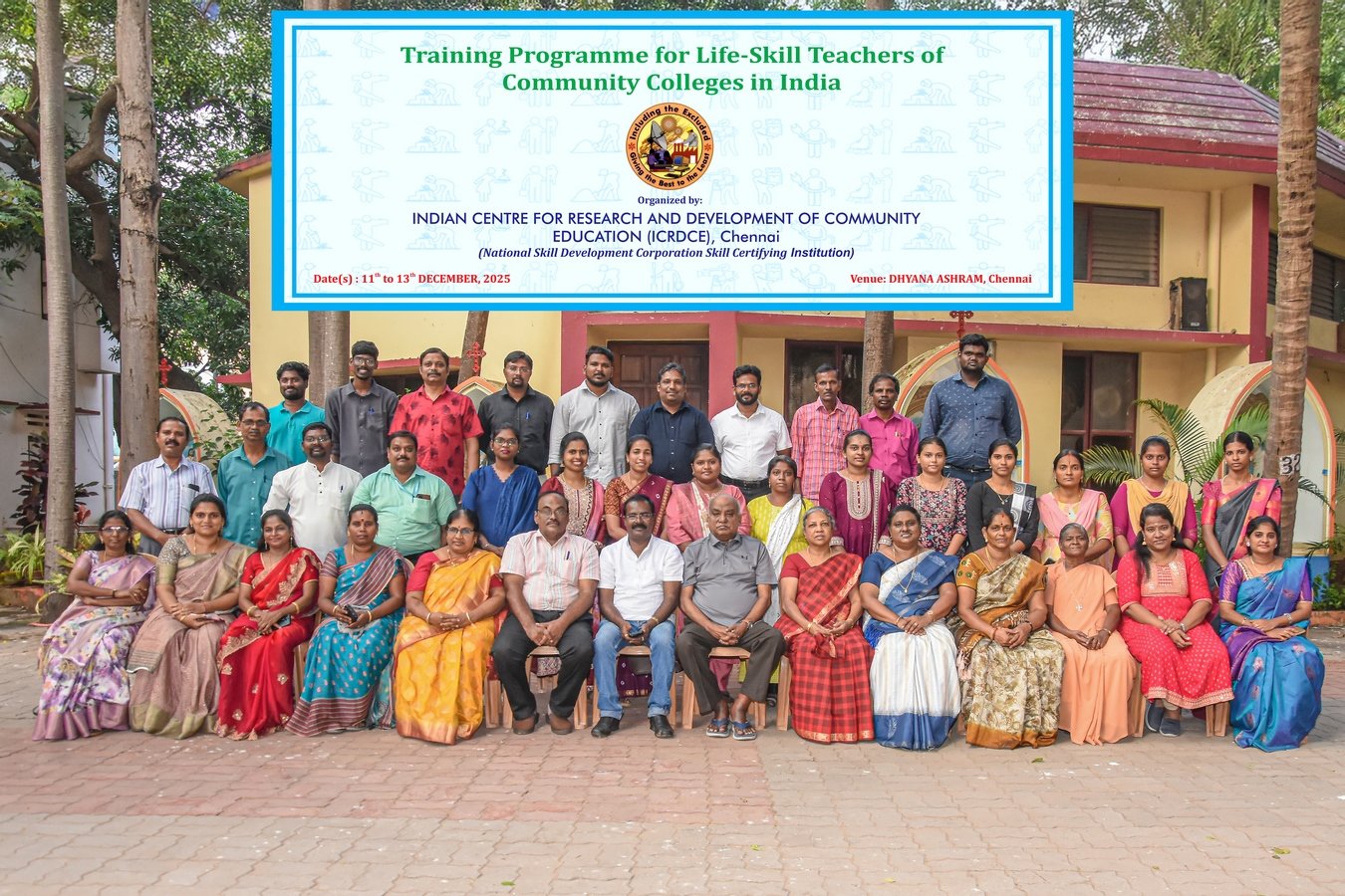 Indian Centre for Research and Development of Community Education (ICRDCE) organized the "Training Programme for the Life - Skills Teachers of Community Colleges in India" in Tamil. The aim of the Programme is to deepen the understanding of life-skills highlighting the philosophy, the power and practice of life-skills on 11th, 12th & 13th December, 2025 at Dhyana Ashram, Chennai in which 40 participants from 21 organizations participated.
